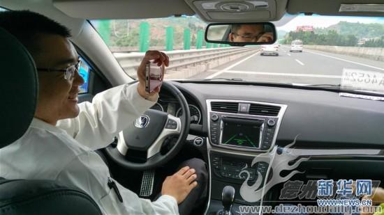 4月12日,两辆银色的无人驾驶汽车从重庆出发前往2000公里外的北京。无人驾驶汽车进入自动驾驶模式后,测试员使用手机进行拍摄,演示自动驾驶的便利性。